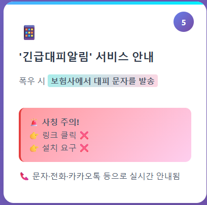 최근 보험사들은 기상특보 발령 시 차량 침수 위험이 있는 지역의 고객들에게 긴급 대피 안내를 제공하고 있습니다. 문자, 전화, 카카오톡 등을 통해 발송되는 이 알림을 받으시면 즉시 차량을 안전한 장소로 이동시켜야 합니다. 다만 해당 메시지에는 앱 설치나 링크 클릭을 요구하지 않으므로, 이런 요청이 포함된 메시지는 사칭일 가능성이 높으니 주의하시기 바랍니다.