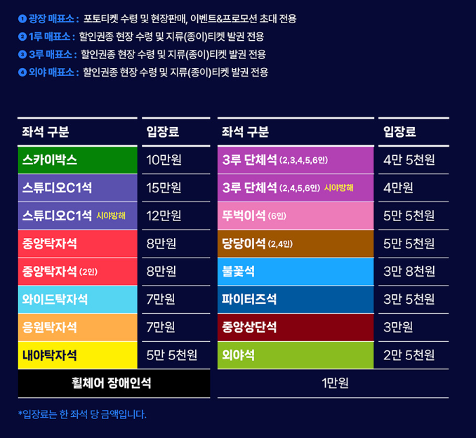 | 국가유공자, 경로우대자(65세 이상), 장애인 | 중앙상단석 12,000원 / 외야석 9,000원 |