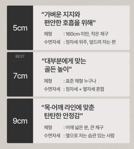 어깨가 넓거나 옆으로 자는 분들은 9cm 선택이 가능합니다